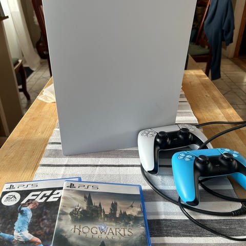 Ps5 slim 1Tb med två trådlösa handkontroller och ett trådlöst headset. Och såklart alla tillhörande kablar som hdmi och laddkabel till kontrollerna.