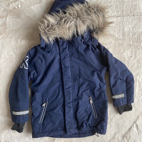 Didriksons Barnjacka i parkas modell, storlek 100, motsvarande 98/104, tillverkad i vattentätt material. Jackan är blå och har huva med avtagbar pälskant. Designad för unisex-användning och utrustad med reflekterande detaljer för ökad synlighet.