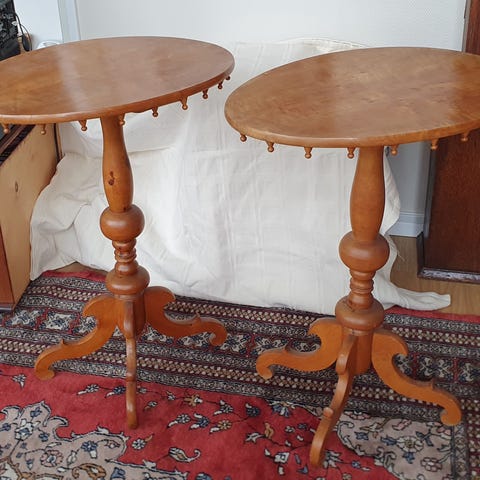 2 Runda sidobord i trä med dekorativ skinnskiva