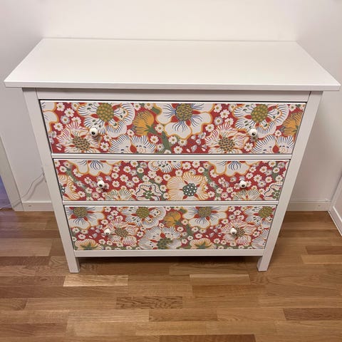 IKEA byrå med flera lådor. Framsidorna är klädda med en blommig tapet. Byrån passar för förvaring i till exempel sovrum, hall eller vardagsrum. Bilderna visar detaljer på ytskiktet, inklusive mindre märken och slitage på mönstret.