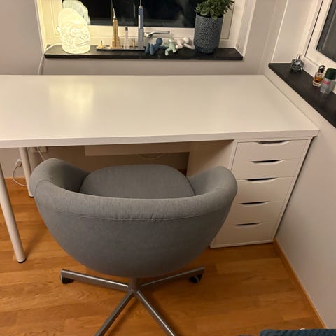 Säljer ett vitt skrivbord och en grå skrivbordsstol, höj och sänkbar. I mycket bra skick .