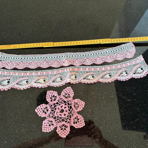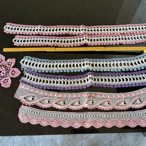Virkad kantband i flerfärgat garn i nyanser av blått, lila och vitt. Längden är cirka 1 meter, enligt måttstocken på bilden. Passar till dekoration av textilier, handarbeten eller andra hobbyprojekt där en dekorativ kant önskas.