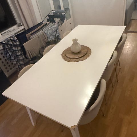 Främst stolarna som är slitna finns en lite märken på bordet kan skicka fler bilder vid behov.