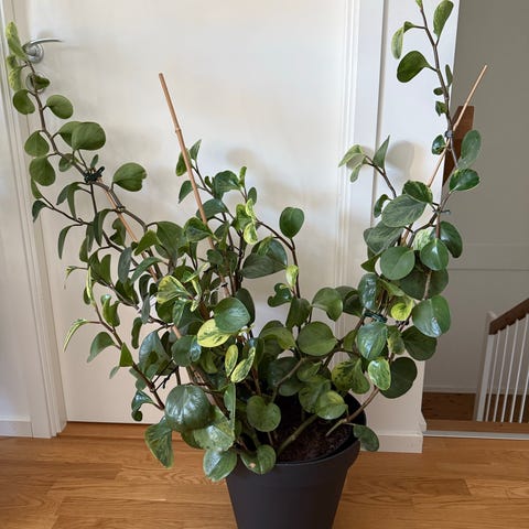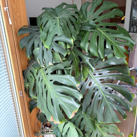 Monstera deliciosa krukväxt i kruka. Växten har stora, gröna, flikiga blad och passar som inomhusväxt i hem eller kontor. Placeras med fördel ljust men inte i direkt stark sol. Kan planteras om i större kruka vid behov för fortsatt tillväxt och kan stödjas med pinne eller spaljé om den blir högre. Den har för två månader sedan blivit omplanteras.