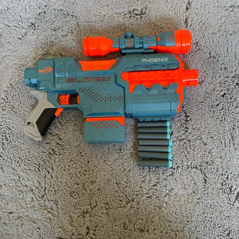 Gul och orange nerf med sikte och pmats med fyra skott inan man behöver ladda om. Nästan ny. Skott ingår ej. Manuell laddning