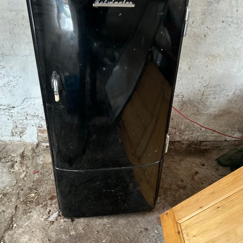 Bredd 50 cm djup 59 cm höjd 120 cm. Fungerar utmärkt. Båda handtagen samt glasskiva ej optimalt.