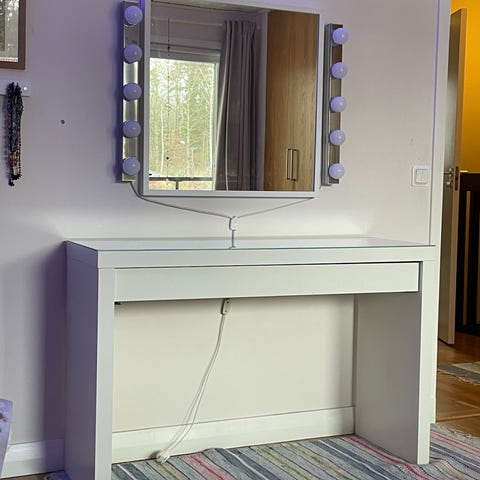 Säljer ett skrivbord/sminkbord med sminkspegel som går att ändra ljusstyrka/dimma. De är varsamt använt med lite repor på glasskivan men inte direkt något som syns tydligt.