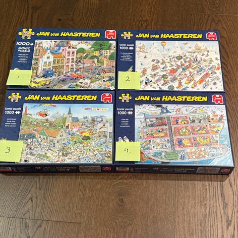 Finnes 4 pussel av Jan van Haasteren. Pussel med roliga detaljer och återkommande personer och djur.