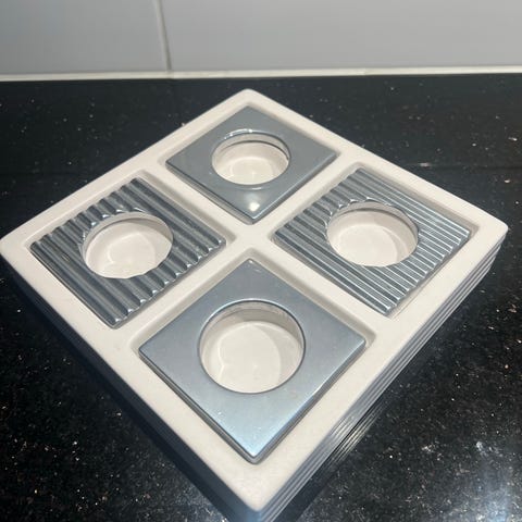 Ljushållare för värmeljus i fyrkantig form. Basen är vit och har plats för ett värmeljus. Till ljushållaren följer flera utbytbara överdelar i olika mönster och färger, bland annat randigt, stjärnmotiv och grafiskt tryck. Passar standardstorlek på värmeljus och kan användas som borddekoration eller stämningsljus i hemmet.