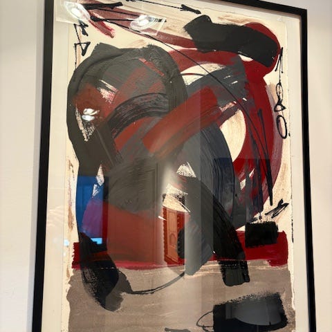 Kjell Andersson konstgrafik. Två tavlor med abstrakt motiv i dova färger. Verken är signerade i nedre kanterna. Motiven har organiska, böljande former mot en mörk bakgrund. Tavlorna är inramade med ljusa ramar och glas. 1000kr för båda tavlorna.