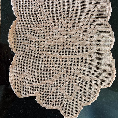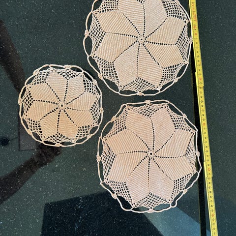 Virkade spetsdukar i bomull. Består av flera delar med blomliknande mönster som kan användas tillsammans eller var för sig. Passar som bordsdekoration, löpare eller underlägg på exempelvis bord, byrå eller hylla mm