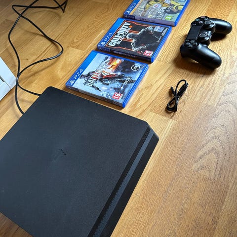 Sony Playstation 4 spelkonsol svart med två handkontroller och spel