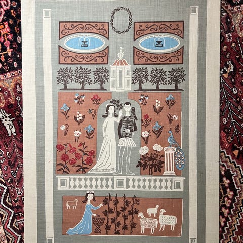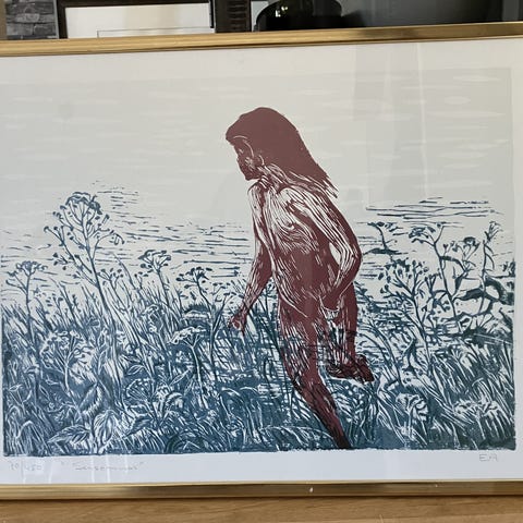 Inramad konstgrafik i form av en etsning i bruna toner. Motivet visar en detaljrik scen med människor, växter och föremål i flera nivåer. Verket är signerat i nederkant. Trycket är monterat med passepartout och sitter i en rektangulär ram med guldfärgad kant.