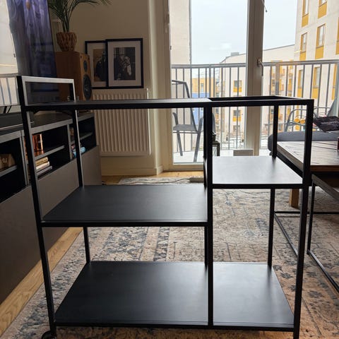 Dekorativ barvagn i valnöt och svart metall med avtagbara brickor vilket gör den både praktisk och snygg. Superfint skick, kan inte hitta några skador. Se bild för barnvagnens mått.