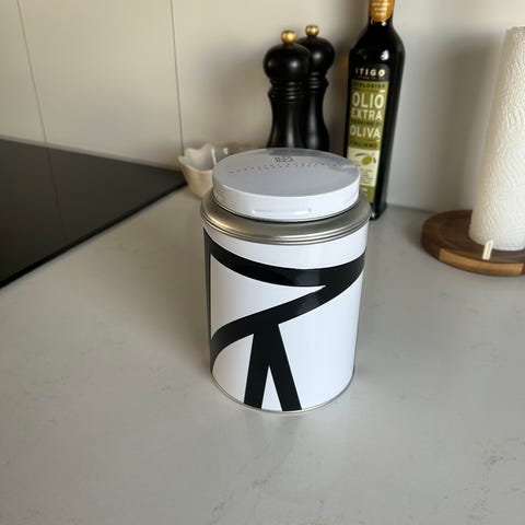 Kaffeburk i vitt porslin med metallock