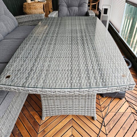 Runt bord med glasskiva och underrede i vitmålad rotting. Bordet har en rund glasskiva upptill och en rund hylla i rotting nedtill för extra avställningsyta. Passar som soffbord, sidobord eller litet matbord i vardagsrum, uterum eller liknande miljöer.