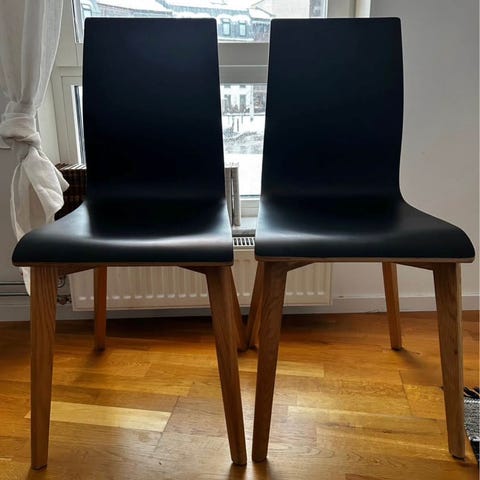 Hej! Säljer 4 st Vilgot stolar från Mio. Fint använt skick. Sits i svart konstläder.