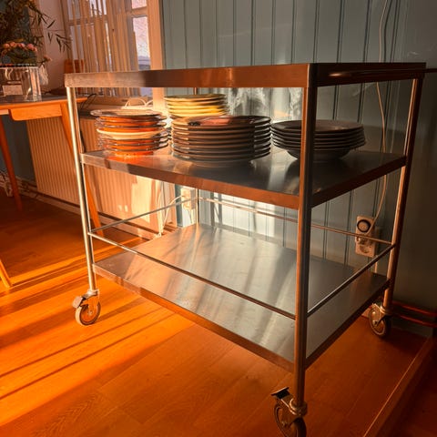 Vagnen har tre plan med upphöjd kant på översta hyllplanet och två djupare hyllor under. Utrustad med hjul för enkel förflyttning.