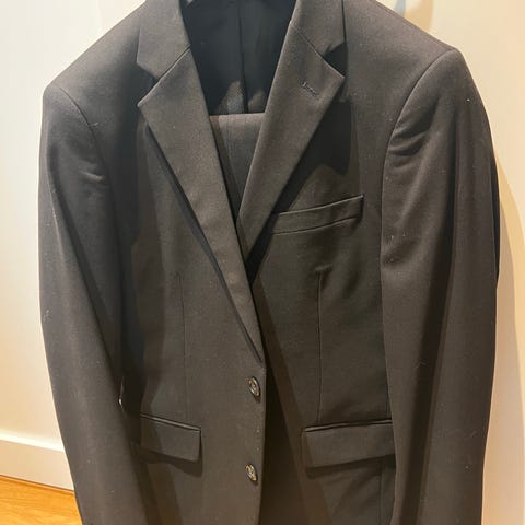 Svart kostym från Selected Homme. Klassisk modell med två knappar fram och sprund baktill. Byxa, smal ungdomlig modell.