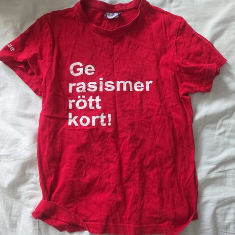 T-shirt för dam i storlek M. T-shirten är svart och tillverkad i bomull. Modellen har kort ärm och rund halsringning. Framsidan har tryck med texten "Rädda Joppe död eller levande" och en illustrerad figur, baksidan är enfärgad.