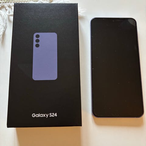 Samsung Galaxy S24 smartphone med 128 GB intern lagring. Enheten har en lila baksida och är i nyskick.