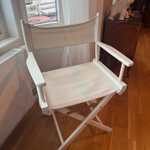 Regissörsstol/Sminkstol. Helt ny. Inköpt från Svensk ridsport. Sits i vitt tyg. Sitthöjd 76 cm.