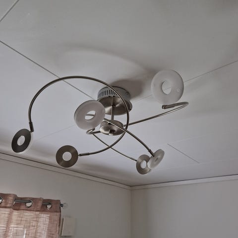 Två stora coola taklampor i metall för allmänbelysning. Diameter ca 60 cm. Fem E14-lampor är ljuskällor.