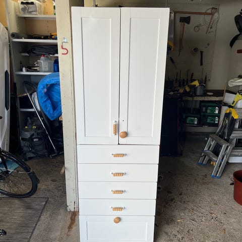 Garderob vit PLATSA från ikea. Dörrar Fonnes. Knoppar från Clas Olsson. Batteridriven belysning x 3 ingår. Inredning se bild. I mycket gott skick.