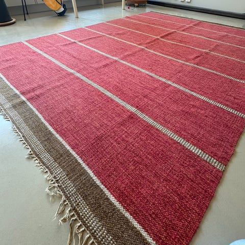 4 st Röda, tunga, tjocka, hårt slagna - vävda mattor i köpta bomulltrasor.