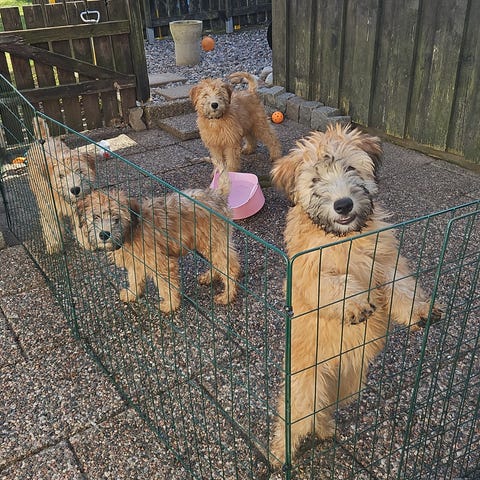 En blandning av renrasig kungspudel (storpudel) och renrasig labrador båda med stamtavla och skk reggade.