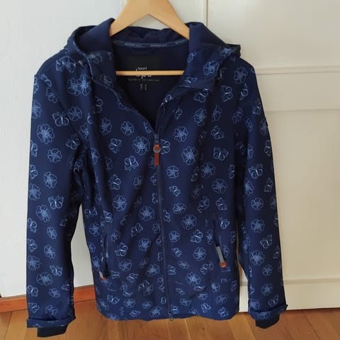 Blå damjacka i storlek L. Ytterplagg med huva och dragsko, knäppning med dragkedja och tryckknappar samt två framfickor med lock. Insida med randigt foder. Passar som vardagsjacka eller lättare ytterjacka.