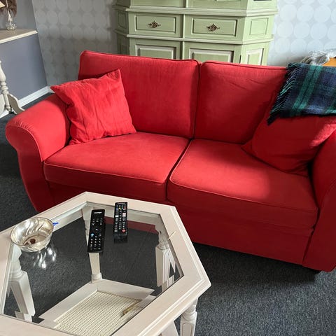 Bäddsoffa som är lite använd, bra skick. Tyget är rent, helt och ej solblekt. Madrasskydd är använt och medföljer om man vill. Har stått längre in i rummet så solen har ej kommit åt den.