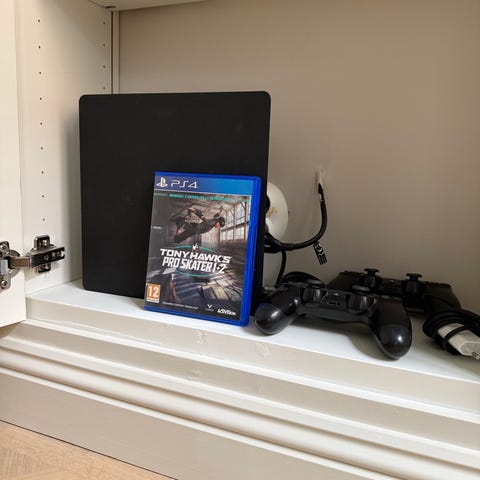 Systemmenyerna på bilderna visar att konsolen är igång och ansluten till en skärm. Eventuella tillbehör som strömkabel och HDMI-kabel och spel som syns på bilderna ingår.