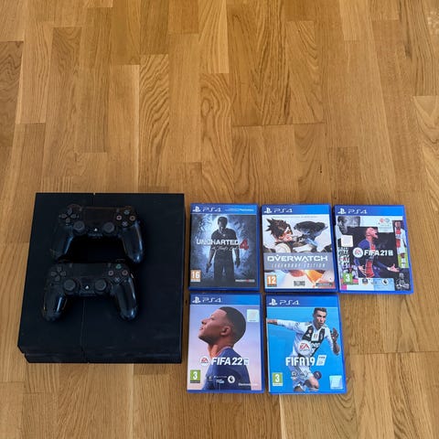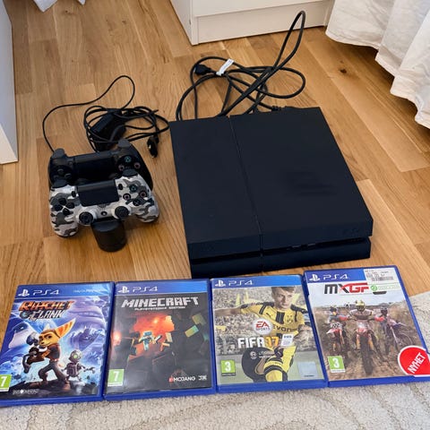 Sony Playstation 4 spelkonsol i svart färg. Konsolen har med en trådlös handkontroll, USB-kabel för laddning av kontroll och flera fysiska PS4-spel som Battlefield 4, Black ops lll, FIFA 17 och Rainbows six siege.