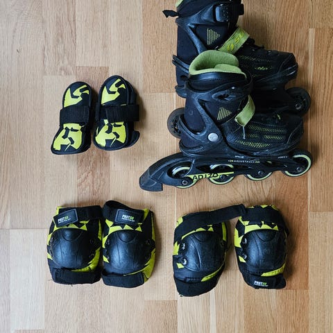 Inlines med justerbar storlek 32-35. Inklusive knäskydd, armbågsskydd och handledsskydd.
