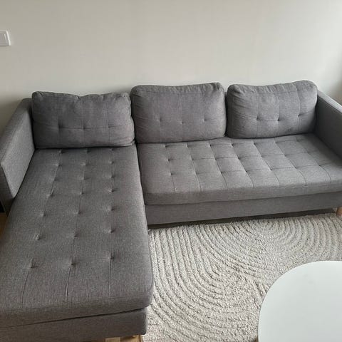 Ljusgrå soffa.