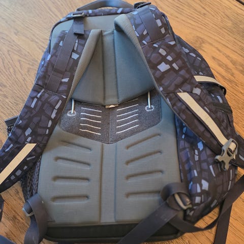 Fästöglor för stavar. Kompatibel med vätskesystem. Justerbar bröstrem. YKK-dragkedjor. Nyckelklämma.