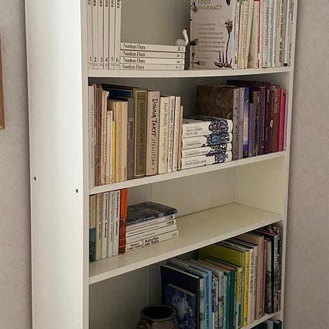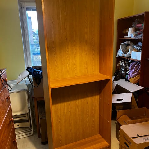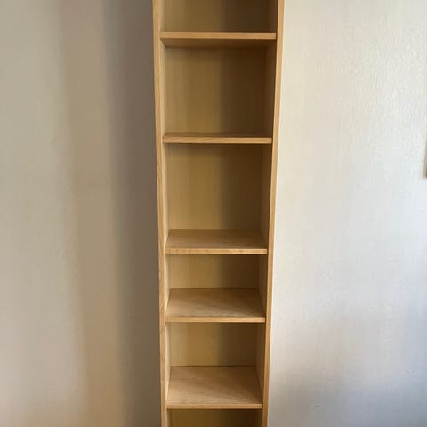 Bakstycket har hål (för sladdar, eluttag) se bilder. Kan behövas spikar i bakstycket för att få hyllan stadigare.