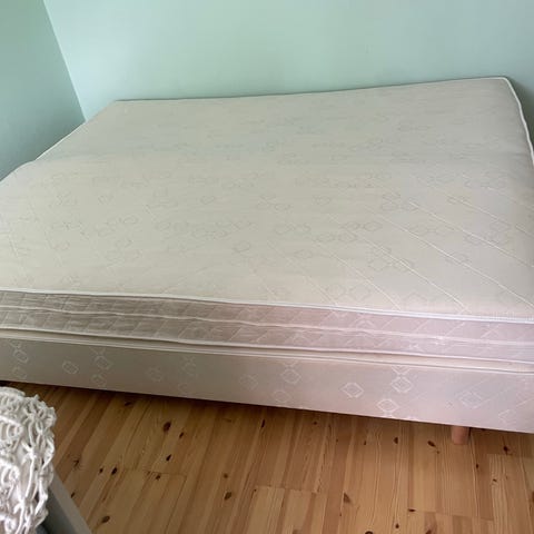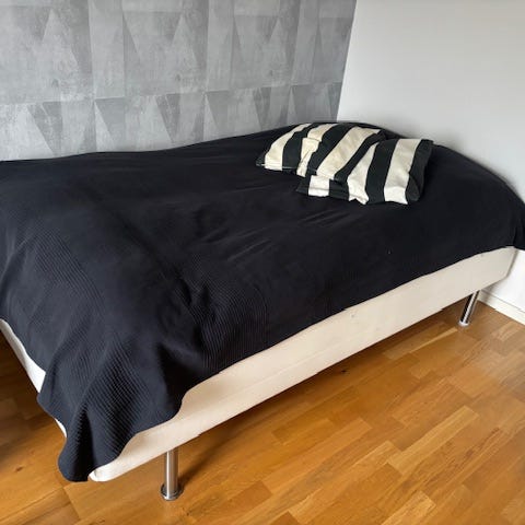 Säng med ben och bäddmadrass Tagjord i memoryfoam från ikea.