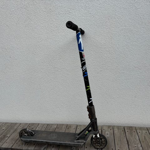 Kaiza sparkcykel i trickmodell med blått deck och svarta detaljer. Styret är rakt och försett med handtag för bra grepp. Deckets ovansida har grepptejp med Kaiza-logga och utskurna partier. Hjulen är små och hårda, anpassade för trickkörning. Bak finns fotbroms över bakhjulet. Undersidan av decket visar tecken på användning. Passar för åkning i skatepark eller på plana underlag. Perfekt för dig som vill börja i kickbike världen. Om fler frågor hör av er
