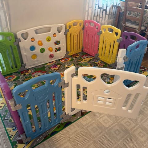 Består av 18 sektioner som kan kopplas ihop eller kopplas isär till en inhägnad yta för lek.