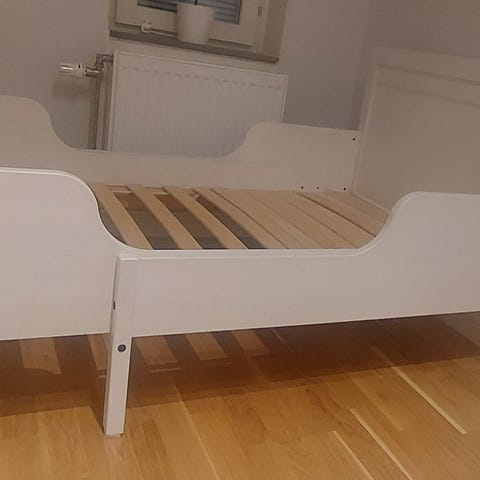 IKEA juniorsäng i vit färg. Sängen är avsedd för barn och är utformad som en juniorsäng. Den har gavlar och sidoskydd enligt modelltyp på bilden samt ribbotten. Mått och eventuell utdragsfunktion framgår av ritningen på bilden, där längden kan justeras i flera steg. Passar som övergångssäng mellan spjälsäng och fullstor säng.