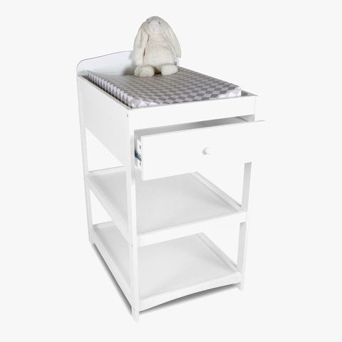 Beemoo skötbord med integrerad badbalja. Överdel med vadderad skötbädd i grått och plastöverdrag. Under skötbädden finns en vit balja med två fack samt en förvaringshylla i tyg/plast längst ner för blöjor och tillbehör. Stomme i metall med fyra ben. Passar för blöjbyten och bad av spädbarn och småbarn. Observera att skötbäddens överdrag har en reva i ena hörnet enligt bild. B48xL80xH101