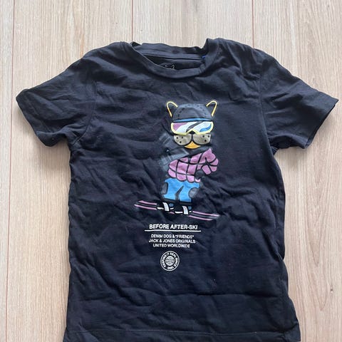 Polarn O. Pyret t-shirt för barn, unisex, i storlek 140. T-shirten är blå och har ett tryck framtill med en hund på skateboard i flera färger.