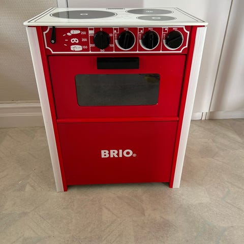 BRIO leksaksspis i vit färg. Klassisk spis i trä med tre spisplattor upptill och ugn med genomskinligt fönster i luckan. Utrustad med vred och tryckknappar på fronten för att efterlikna en riktig spis. Avsedd för barn som vill leka kök och matlagning inomhus.