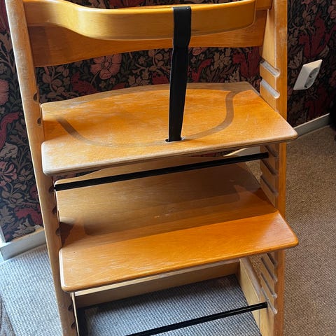 Säljer en begagnad Stokke barnstol i gott skick. Stabil och ergonomisk stol som växer med barnet och passar perfekt vid matbordet. Justerbar sits och fotstöd.