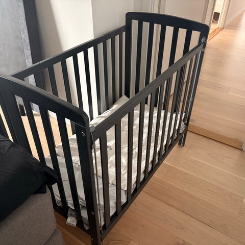 Mörkgrå spjälsäng i trä, Troll Luxe. Möjlighet att ställa in läget i tre olika nivåer beroende på ålder på bebis/ småbarn. (0- ca3 år)