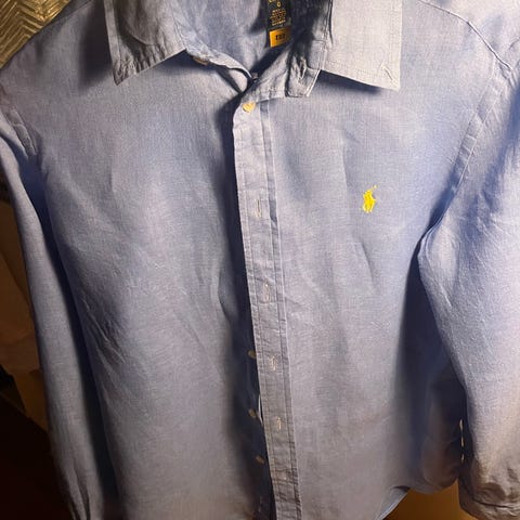 Ralph Lauren skjorta för pojke i storlek M 12/14 Långärmad skjorta i blå bomull med knappar framtill och krage med knappar. Bröstet har broderad logotyp.