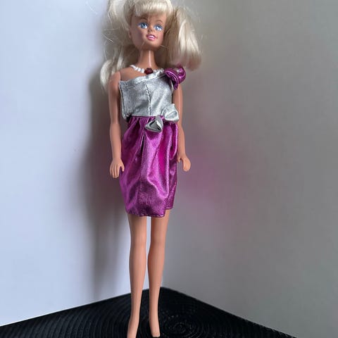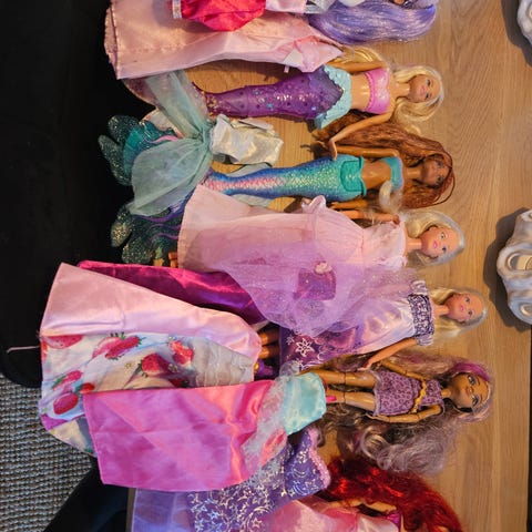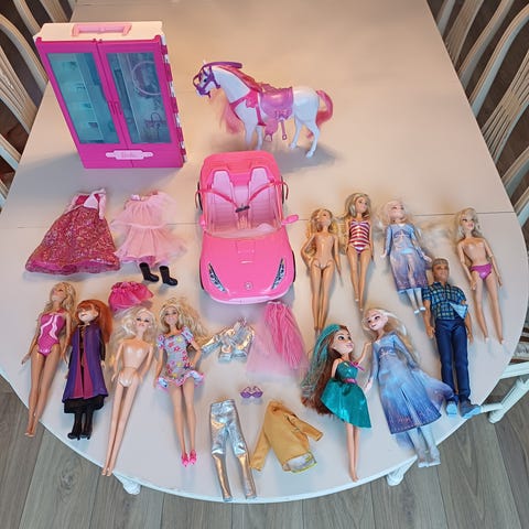 Barbie dockor med bil och tillbehör. Setet innehåller flera Barbie-dockor med olika kläder samt en rosa bil med två säten. Till setet hör även diverse små tillbehör som väskor, skor och accessoarer. Passar för lek med Barbie-värld och kan kombineras med andra Barbie-produkter.