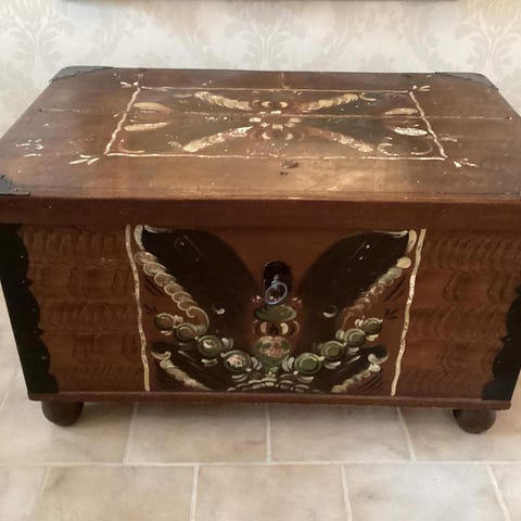 Träskrin med järnbeslag och målad dekor